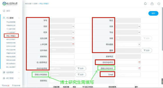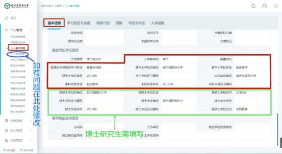 2、各位研究生进入系统后,请在页面左侧信息栏中进入“个人管理”模块下的“个人基本信息”中的“基本信息”部分,按照图1、图2、图3、图4指示确认所有学籍信息,如需修改则进入“个人信息维护”部分进行修改。(其中红框项目请所有研究生务必保证填写正确;绿框内为博士需要确认的信息,硕士不需填写)