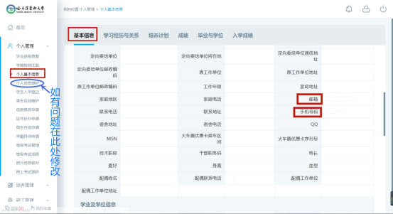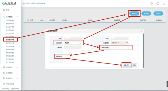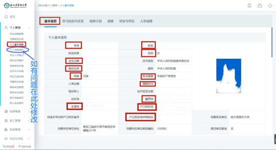 4、因部分学籍信息研究生没有权限自行修改,在填写过程中如遇到此类信息与本人情况不符,请进入“个人管理”模块下的“信息修改申请”部分,按照图7的指示申请修改学籍信息,待管理端教师审核通过后即可修改。