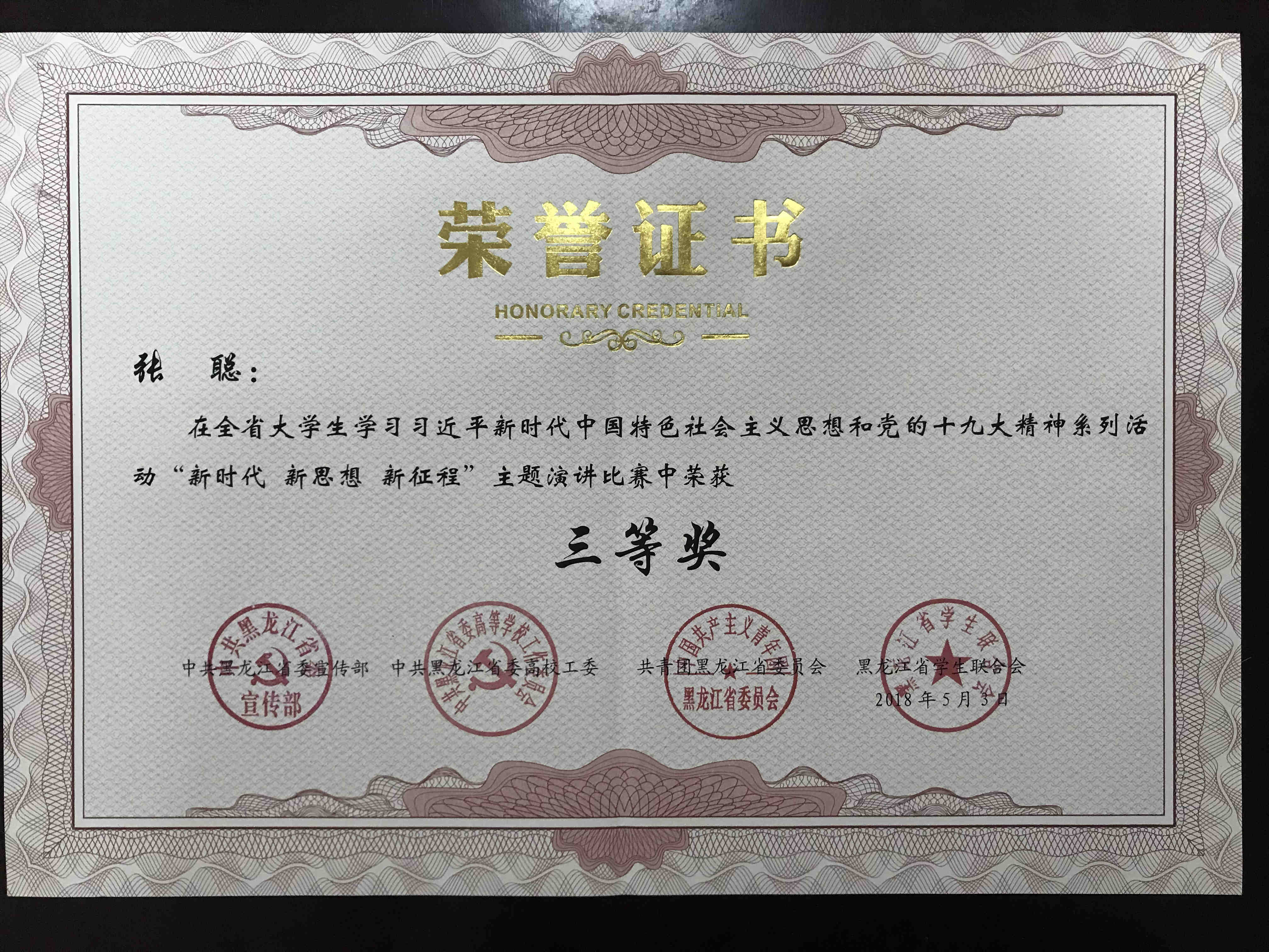 2018年4月23日,为了响应十九大对青年“继承传统、承接使命、继续奋进”的要求,由省委宣传部、省委高校工委、省教育厅、省团委、省学生联合会共同主办以“新时代 新思想 新征程”为主题的演讲比赛,旨在让当代青年了解“十九大”精神,增强其历史使命感与责任感,使其深学、悟透、笃行习近平总书记的新时代中国特色社会主义思想。经过前期激烈的比拼,我校硕士研究生张聪同学从27所高校的76名选手中脱颖而出,荣获本次大赛三等奖。